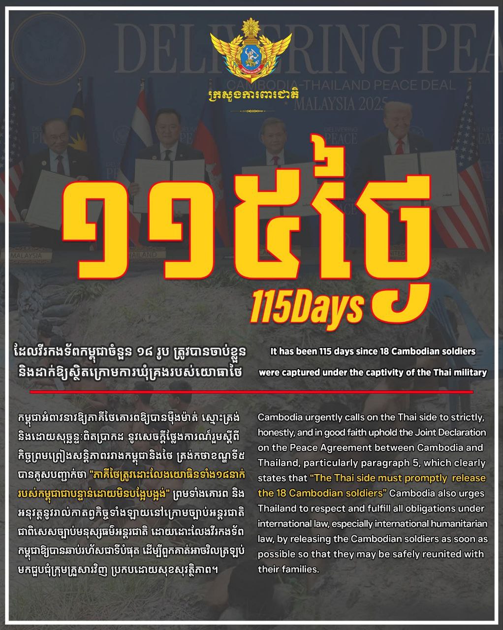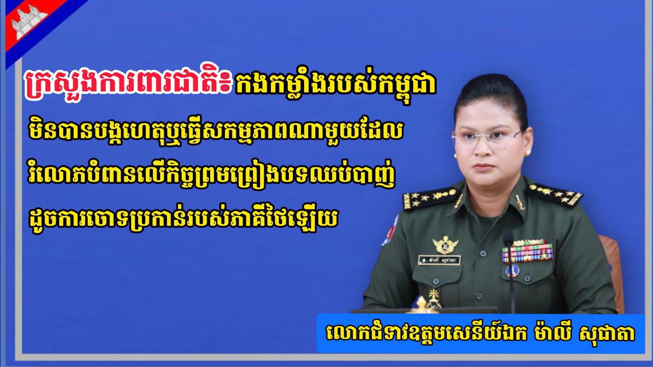 យោងតាមការបង្ហោះផ្សាយនៅក្នុងបណ្តាញសង្គមរបស់ក្រសួងការពារជាតិបានឱ្យដឹងថា លោកជំទាវ ឧត្តមសេនីយ៍ឯក ម៉ាលី សុជាតា អ្នកនាំពាក្យក្រសួងការពារជាតិ នៃព្រះរាជាណាចក្រកម្ពុជា បានបញ្ជាក់ថា នៅថ្ងៃទី៣ ខែធ្នូ