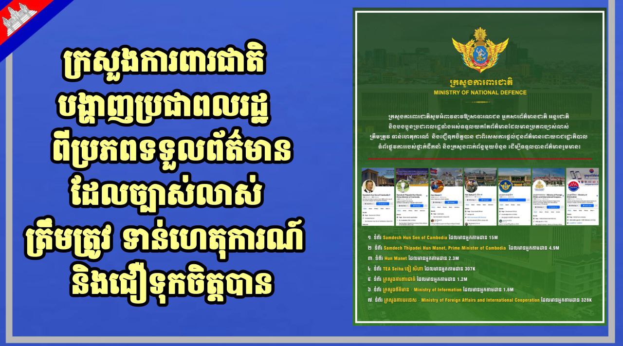 ក្រសួងការពារជាតិ៖ កម្ពុជាមិនបានដាក់មីនថ្មីដូចថៃចោទប្រកាន់នោះទេ ហើយកាលពីថ្ងៃទី២ធ្នូកន្លងទៅ ក៏មិនមានឮសំឡេងផ្ទុះមីនដូចកងទ័ពភូមិភាគ២ថៃលើកឡើងដែរ