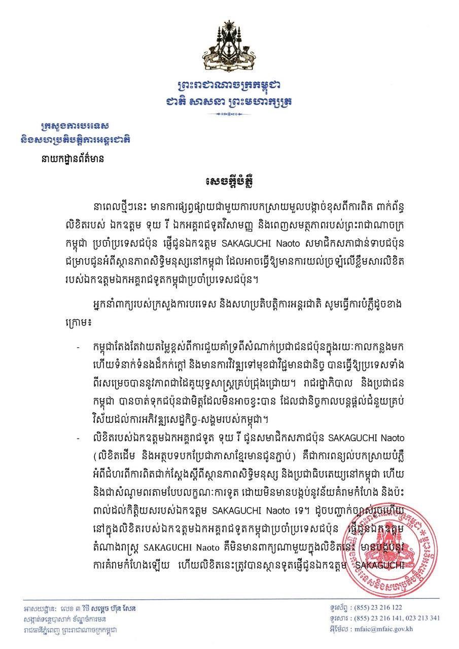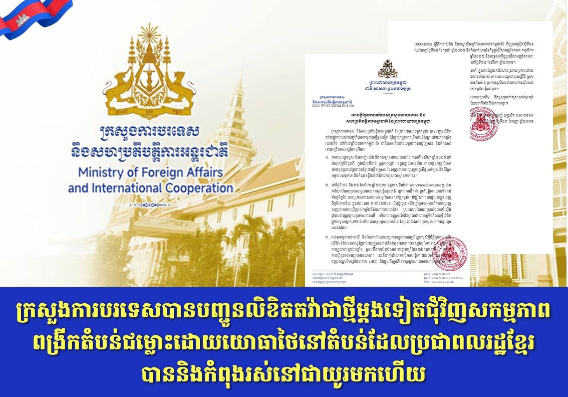 ក្រសួងការបរទេសបានបញ្ជូនលិខិតតវ៉ាជាថ្មីម្តងទៀតជុំវិញសកម្មភាពពង្រីកតំបន់ជម្លោះដោយយោធាថៃនៅតំបន់ដែលប្រជាពលរដ្ឋខ្មែរបាននិងកំពុងរស់នៅជាយូរមកហើយ