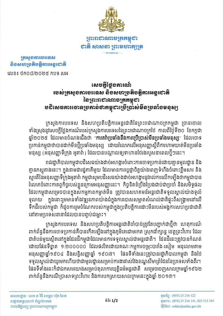 ក្រសួងការបរទេស និងសហប្រតិបត្តិការអន្តរជាតិ នៃព្រះរាជាណាចក្រកម្ពុជានៅថ្ងៃទី៣ ខែកញ្ញា ឆ្នាំ២០២៥ បានចេញសេចក្តីថ្លែងការណ៍ដោយបញ្ជាក់ថា ក្រសួងបានបញ្ជូនលិខិតតវ៉ាជាផ្លូវការរបស់រាជរដ្ឋាភិបាលកម្ពុជាជាថ្មីម្តងទៀតជុំវិញសកម្មភាពពង្រីកតំបន់ជម្លោះដោយកងកម្លាំងយោធាថៃនៅតំបន់ព្រំដែនគោកកម្ពុជា-ថៃជាពិសេសតំបន់ដែលប្រជាពលរដ្ឋខ្មែរបាននិងកំពុងរស់នៅជាច្រើនទសវត្សរ៍មកហើយ។ នៅក្នុងសេចក្តីថ្លែងការណ៍នោះដែរ