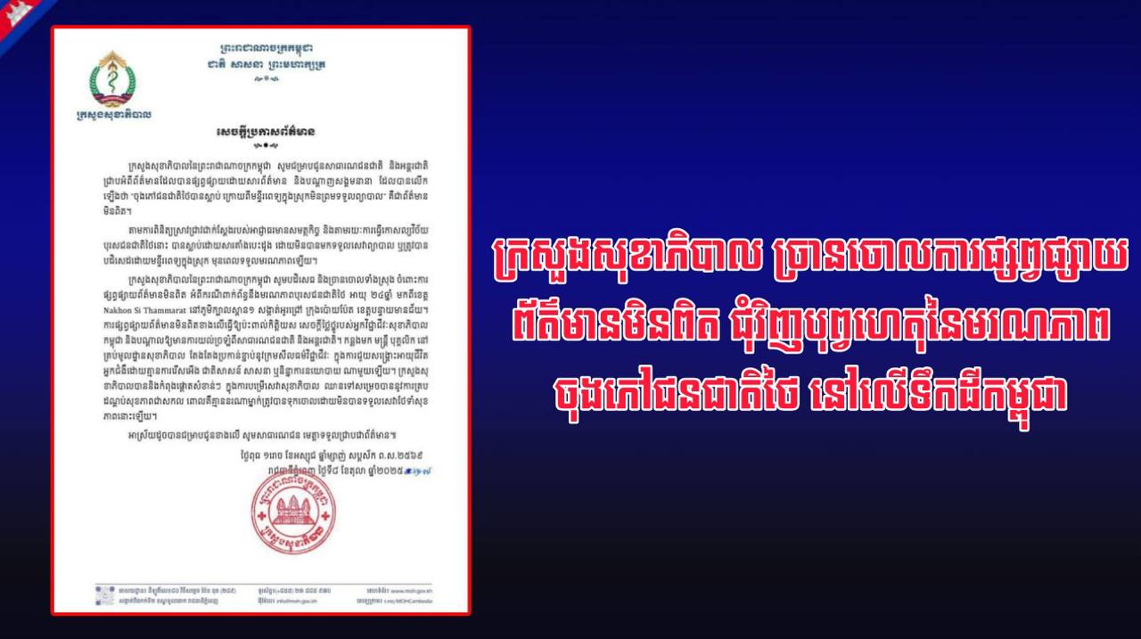 ក្រសួងសុខាភិបាលនៃព្រះរាជាណាចក្រកម្ពុជា បានប្រកាសច្រានចោលទាំងស្រុង ចំពោះការផ្សព្វផ្សាយព័ត៌មានមិនពិត អំពីករណីពាក់ព័ន្ធនឹងមរណភាពបុរសជនជាតិថៃ ដែលថា «ចុងភៅជនជាតិថៃបានស្លាប់ ក្រោយពីមន្ទីរពេទ្យក្នុងស្រុកមិនព្រមទទួលព្យាបាល»គឺជាព័ត៌មាន មិនពិត។ យោងតាមសេចក្ដីប្រកាសព័ត៌មាន
