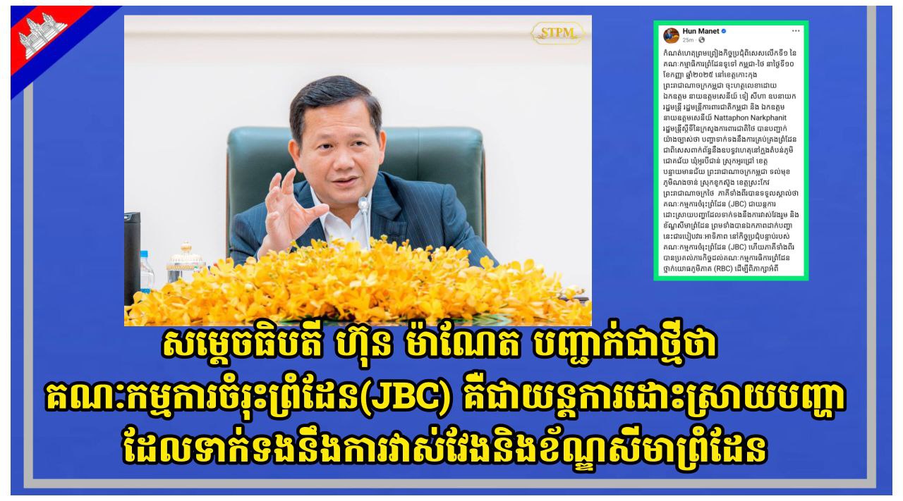 សម្តេចធិបតី ហ៊ុន ម៉ាណែត បញ្ជាក់ជាថ្មីថា គណៈកម្មការចំរុះព្រំដែន(JBC) គឺជាយន្តការដោះស្រាយបញ្ហាដែលទាក់ទងនឹងការវាស់វែងនិងខ័ណ្ឌសីមាព្រំដែន