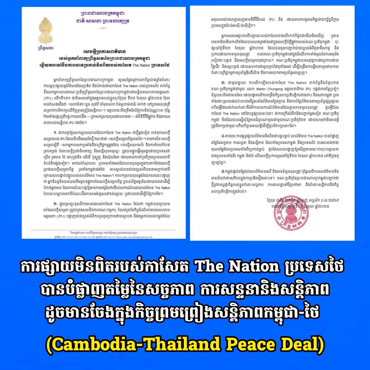 ព្រឹទ្ធសភាកម្ពុជា៖ ការផ្សាយមិនពិតរបស់កាសែត The Nation ប្រទេសថៃ បានបំផ្លាញតម្លៃនៃសច្ចភាព ការសន្ទនានិងសន្តិភាពដូចមានចែងក្នុងកិច្ចព្រមព្រៀងសន្តិភាពកម្ពុជា-ថៃ (Cambodia-Thailand Peace Deal)