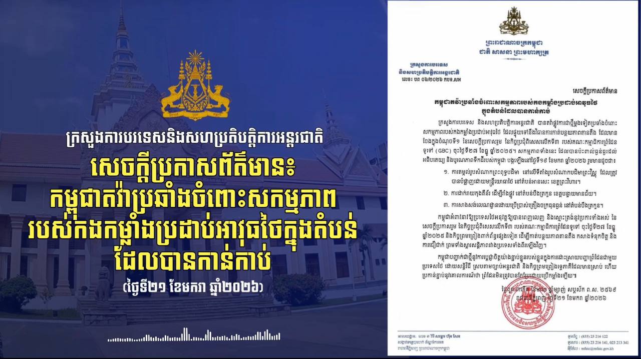 សេចក្ដីថ្លែងការណ៍ ស្ដីពី«បច្ចុប្បន្នភាពស្ដីពីការវិវត្តន៍ស្ថានការណ៍ព្រំដែនកម្ពុជា-ថៃ» ថ្ងៃទី៩ ខែមករា ឆ្នាំ២០២៦