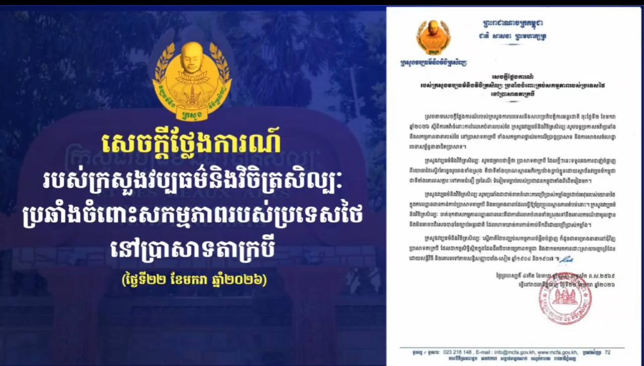សេចក្តីថ្លែងការណ៍របស់ក្រសួងវប្បធម៌និងវិចិត្រសិល្បៈ ប្រឆាំងចំពោះសកម្មភាពរបស់ប្រទេសថៃនៅប្រាសាទតាក្របី